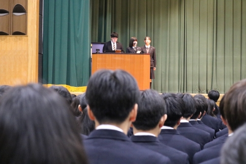 本日4月14日(月)講堂にて、避難訓練・学級委員任命式が終わった2校時に、1年生を対象に各クラブの代表生徒がクラブ活動紹介を行いました。
