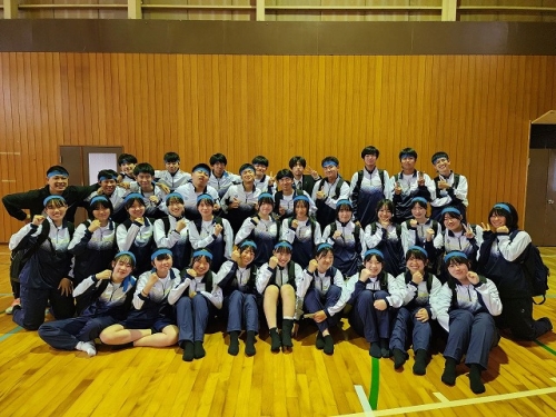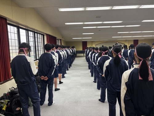 初日はあいにくの雨模様となりましたが、生徒たちは室内での活動に元気いっぱい取り組みました。集団行動や礼法、体操、校歌の練習は体育館と観光センターに分かれて実施し、限られた環境の中でも集中して活動に励む姿が見られました。