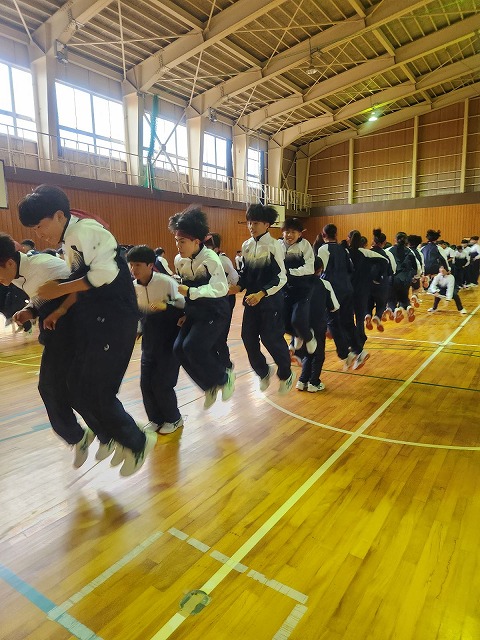 また、クラス対抗のチームジャンプを行い、笑顔と活気あふれる時間となりました。お互いに声を掛け合いながら協力し、クラスの絆を深める貴重な機会となりました。
