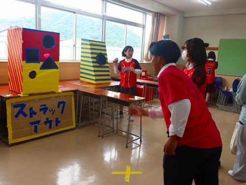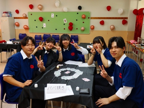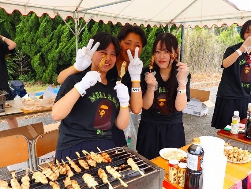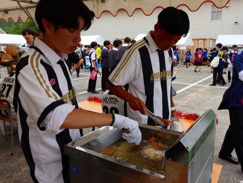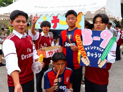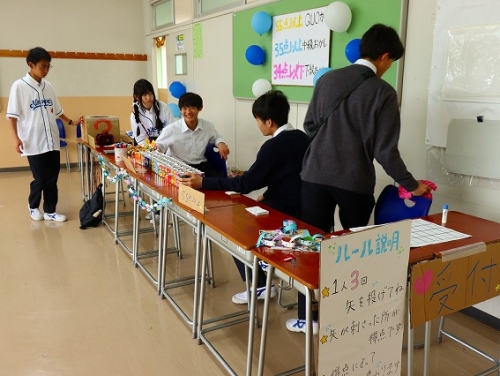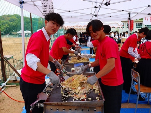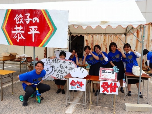 2年生は校舎内で射的、ダーツ、お菓子釣りなどの調理を伴わない模擬店を出店し、3年生はグラウンドで調理を伴う食べ物の模擬店を出店しました。どのクラスのお店も、店舗の装飾や宣伝がユニークで目を引き、多くのお客さんで賑わっていました。模擬店と並行して、教室では書道部や陶芸部の作品展示、創作アート部の作品の展示・販売、ホームメイキング部の焼き菓子販売、茶道部のお茶席など文化部も大活躍でした。また、大会議室ではeスポーツ大会、講堂では音楽部の演奏や筋肉自慢コンテスト、女子ダンス部の演技が行われ、体育館では、ダンスバトルや有志のパフォーマンス、歌うま王座決定戦の決勝が行われました。校内のいたるところには、1年生がクラスで作成した看板や顔出しパネルなどが展示され、生徒や来場者の方々が写真を撮る姿も見られました。