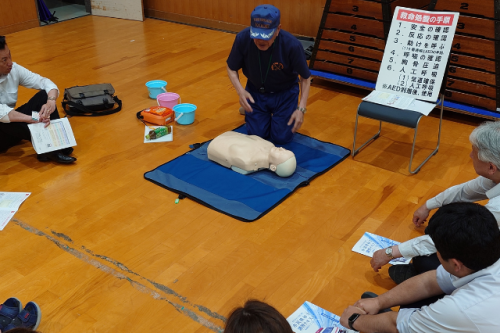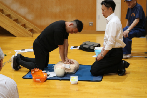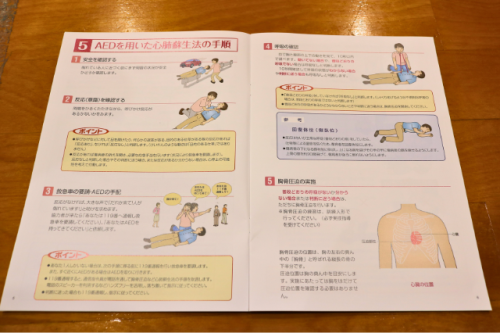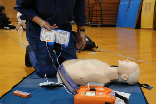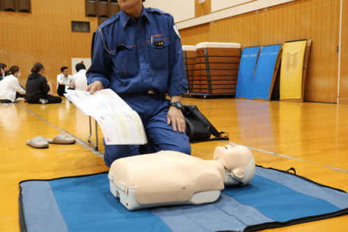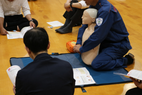 心肺蘇生法は、①倒れている人の周囲の安全を確認②軽く肩をたたいて反応を確認③周囲の人にも助けを求めて救急車とAED(自動体外式除細動器)を要請④胸骨を30回圧迫する作業を繰り返す――という一連の手順があり、人形を使っての実習でAEDの使い方も確認しました。また、気道に異物が詰まった場合の除去方法も学びました。