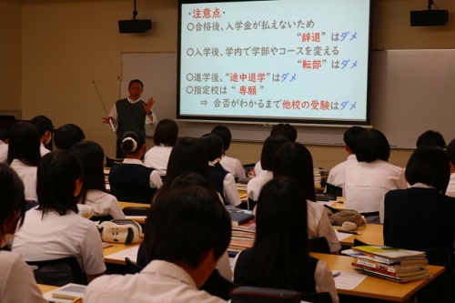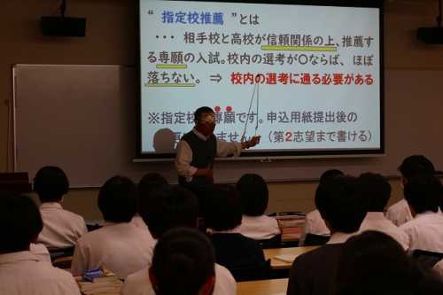 指定校推薦の制度についての基本的な説明から選抜方法や選考を受けるうえでの注意事項、日程を含む今後の予定などについて解説し、生徒はメモを取りながら真剣に耳を傾けていました。指定校推薦では選考試験に加え、校内選考会が行われるため、合格を勝ち取れるように担任の先生方と密に進路相談をしながら、しっかりと事前準備をすることが重要です。