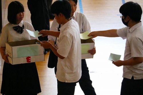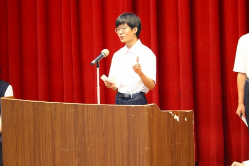 7月7日(月)、次期生徒会役員を決める生徒会役員改選を行いました。「応援弁士と立候補者の演説を聞いて、生徒会役員に相応しいと思う人をしっかり考えた上で投票してください」と、3年生の現生徒会役員による司会で始まりました。