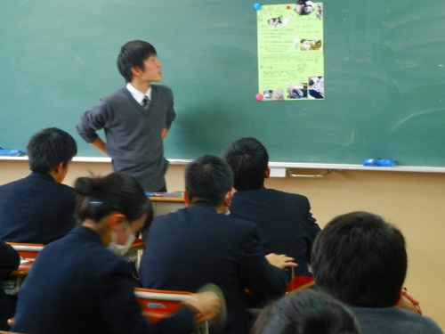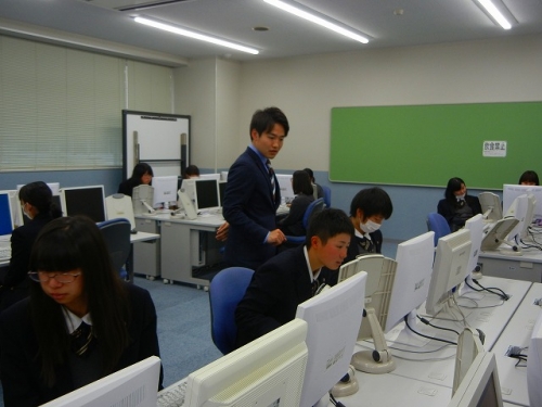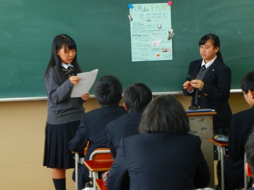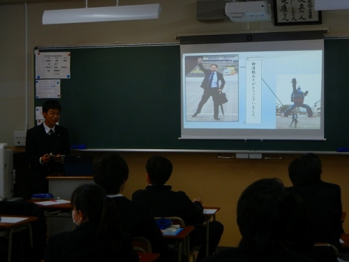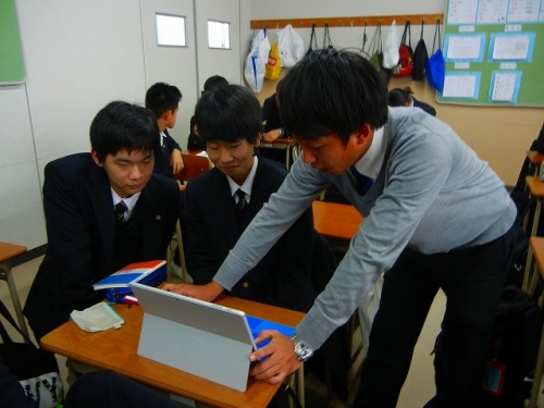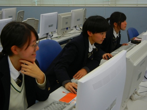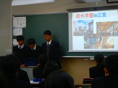 11月28日(水)の6時限の「ホーム・ルーム」で、1年生は各クラスで校外学習(11月8日)の現地調査・報告発表が行われました。それぞれのテーマ(観光都市神戸の特徴・地域商店街活性化方法・防災学習など)を持っての現地調査・インタビューの結果を、パソコンや画用紙を活用してのグループ発表会でした。互いに発表評価(内容・話し方・態度・資料)を採点することで、プレゼンテーション能力が蓄えられ有意義な時間となりました。