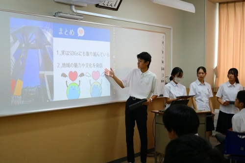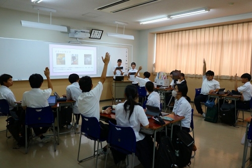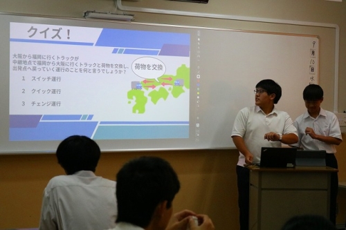 9月10日(水)、特進Sコースの1年生が夏休み中に参加したインターンシップについての発表会が行われました。今年も「株式会社 みなと銀行」「株式会社 日本旅行」「株式会社 大協」「SMBC日興証券株式会社」「山口運送株式会社」の5社にご協力いただき、各会社に2~4名の生徒がインターンシップをさせていただきました。