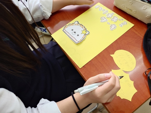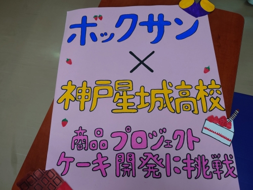 「神戸洋藝菓子 ボックサン」様とコラボさせていただいているチームは、今後予定している「ケーキ」のポスターやポップを作成しました。ケーキには本校校内で栽培しているサツマイモやカボチャをメインに使ったケーキになります。
