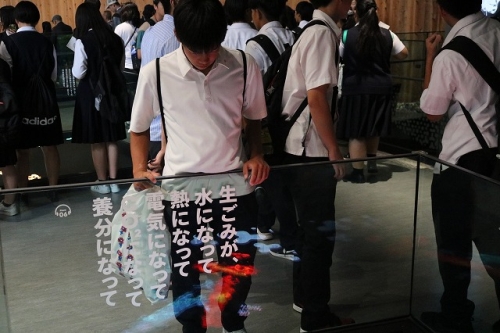 1年生は今回「日本館」を時間帯別に見学をしました。日本館のテーマは、「いのちと、いのちの、あいだに」です。その根底にある「循環」の価値を知ることができる構造になっていて、3つある出入口のどこから入り、どこから出るかによって、異なる物語を味わうことができるのも特徴ですが、今回は「Plant→Farm→Factory」といった順番で3エリアを観覧することができました。