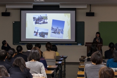 日程説明(北野ツーリスト)に続いて、昨年度参加した生徒の体験発表を行い、実感が沸いたようでした。