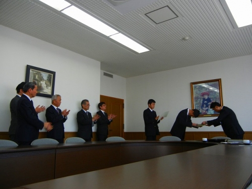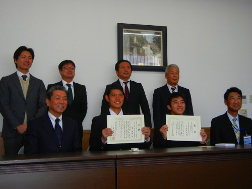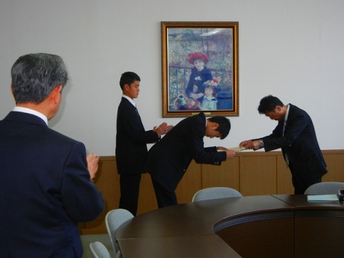 緊張していた二人の表情も、校長先生のお褒めの言葉にやわらぎ、和やかな雰囲気で終了しました。2学期終業式に表彰伝達されます。