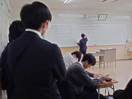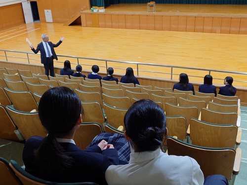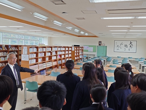 本日(11/5・水曜日)、加古郡稲美町にある「稲美北中学校」の2年生18名と引率の先生が、神戸星城高校を訪れてくれました。到着後、本校職員がお出迎えし、1階にある大会議室に案内しました。その後、5階のライブラリーや4階のコンピュータ室、3階の1年1組の英語の授業を見学し、2階の講堂やカフェテリアを案内しました。