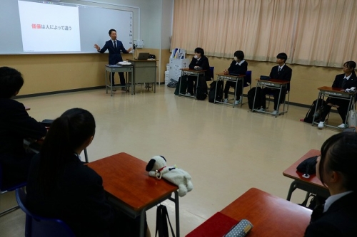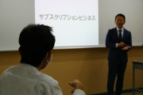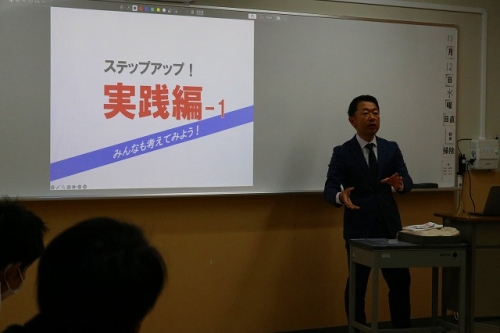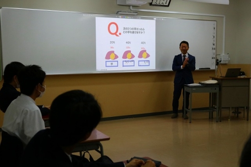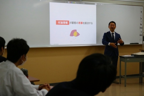 11/12(水)特進Sコースの1年生が経営者の方からの授業を受講しました。全7回のうち第5回目となる今回は、マーケティングの考え方や商品の機能的価値、情緒的価値についてレクチャーしていただきました。