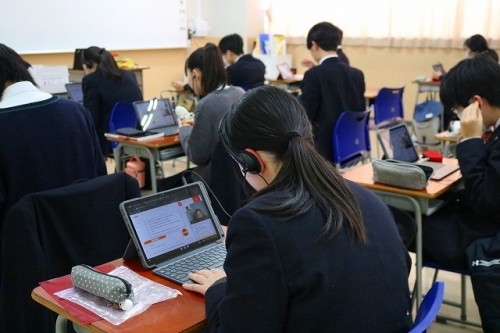 2/13(金)、特進Sコース1年生の「論理・表現」の授業内で「オンライン英会話」学習が行われました。実践的な学習を通して”英語で聞く・英語で話す”ことに慣れ、主体的な英会話スキルを身につけることが目的です。