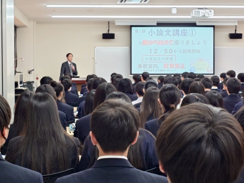 本日、3月6日(金)より、新3年生を対象に小論文講座がスタートしました。今年は昨年以上に受講人数が多く、230名以上の生徒が出席となり、大会議室だけでは収容できないため、別教室にもその講義内容をプロジェクターを通して中継し、リモートで講義を受ける形を導入しました。また添削をする教職員も各教室へ分かれて、同時並行で授業を受ける形をとっています。このように同じ講義を受けた生徒と先生が一体となり、小論文に取り組むという姿勢を本校では大切にしています。