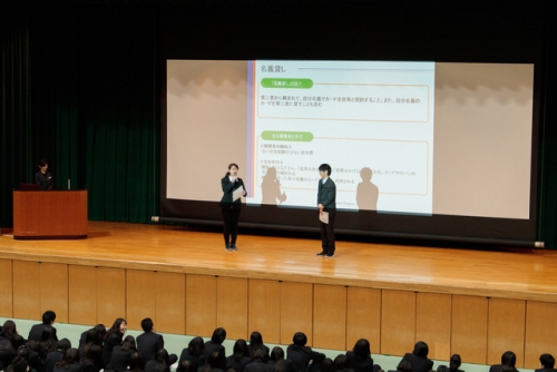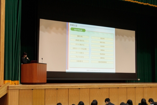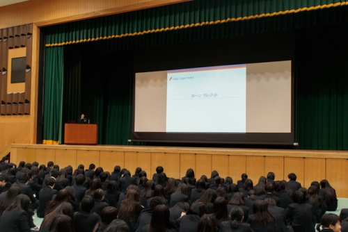 2月13日(火)、講師としてSMBCコンシューマーファイナンス株式会社の方をお招きし、3年生は講堂で「金融経済教育セミナー」を受講しました。「契約する」とはなにかのクイズからセミナーはスタートし、ローンやクレジットを正しく利用するためには契約について理解する必要があると話されました。