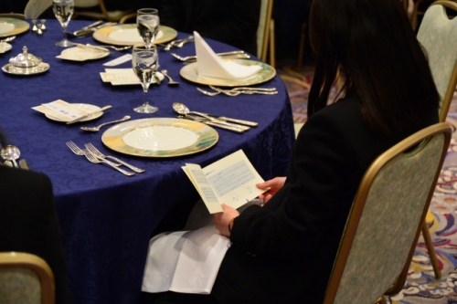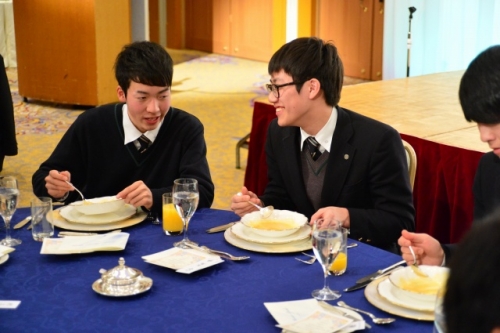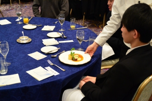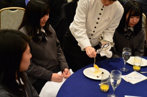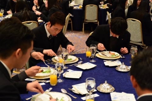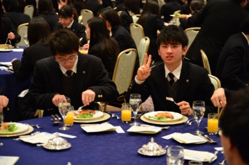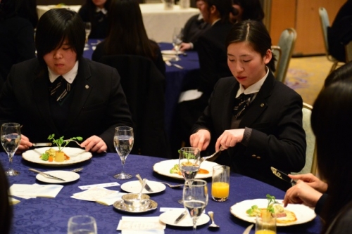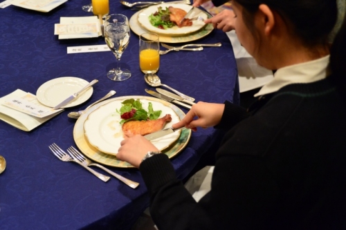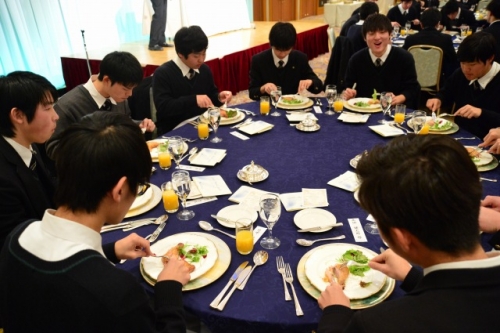 座席の座り方から、ナイフ・フォークの使い方とマナー指導が始まりました。生徒たちは慣れない雰囲気とフランス料理のせいか緊張しながらも、美味しい料理に舌鼓をうっていました。