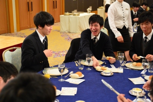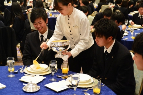 このテーブルマナー講習は、卒業を前にした3年生を対象に実施する学年行事です。食事マナー及びホテル内でのマナーを体験し修得することを目的としています。卒業後、結婚式などの冠婚葬祭で必要となってくる最低限のマナーを実際に経験しておくことで、恥ずかしくない立ち振る舞いができる人間になることでしょう。