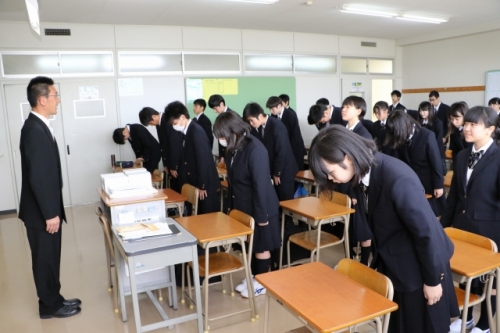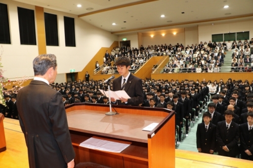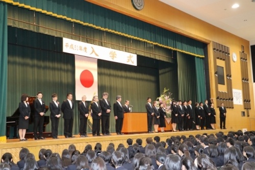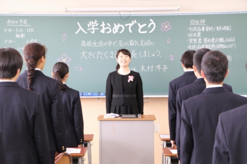 育友会代表祝辞、祝電・祝詞披露に続き、新入生の宣誓がありました。その後、音楽部伴奏、生徒会・有志合唱による校歌斉唱で、入学式は終了しました。学校長より第1学年教員の紹介の後、新入生は担任引率のもと、各教室で高校生活初めてのホームルームを行いました。