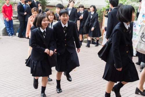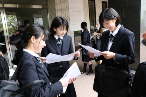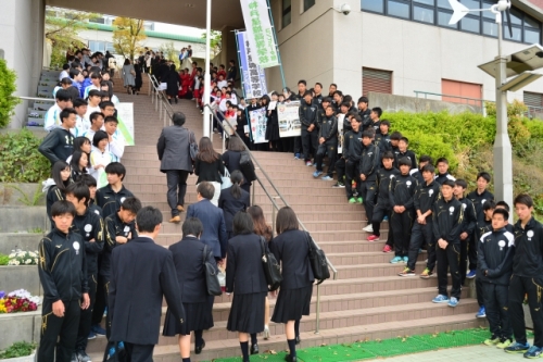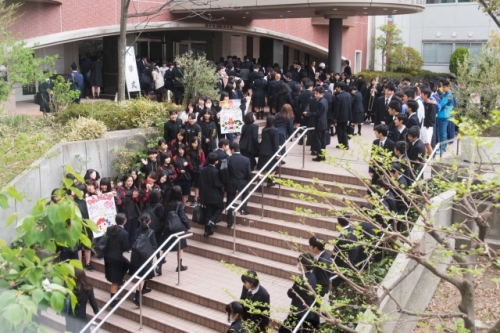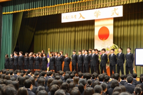 通学路の満開の桜の下を、真新しい制服に身をつつんだ新入生434名が登校してきました。期待と不安の新入生を出迎えるのは、中央階段に入部勧誘の看板を手にユニホーム姿のクラブ部員の笑顔と大きな挨拶の声です。新入生はそれぞれ教室から、担任の先生の引率で講堂に集合しました。多くの保護者の皆さまと新入生で講堂が満員状態で入学式が始まりました。