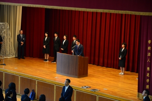 新しく着任された教員の挨拶と2・3年生関係教員の紹介がありました。その後の対面式は、生徒会副会長の「新入生歓迎のことば」から始まりました。