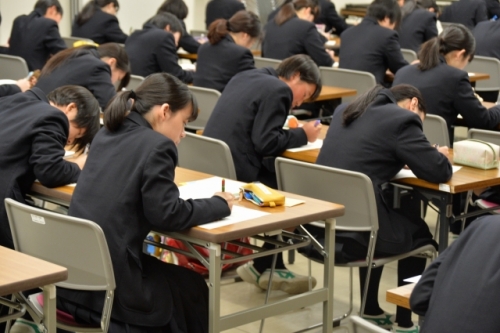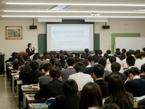 また、大学進学希望者を対象とした小論文講座が継続実施されています。第Ⅱ期の第2回目となる本日は約150名の進学希望者が出席し、京都府立大学の過去問を教材に「雇用状況の変化の特徴について」というテーマに取り組みました。