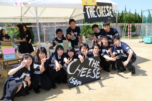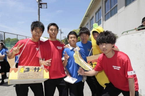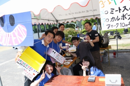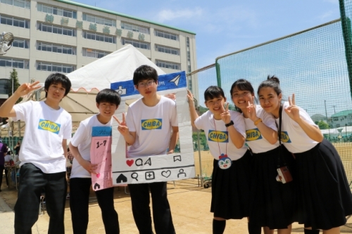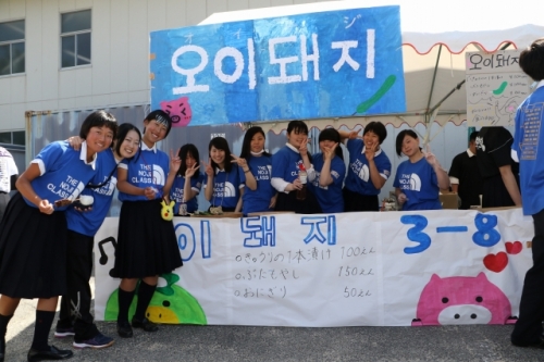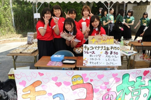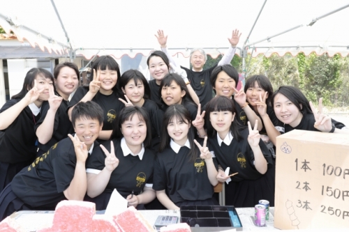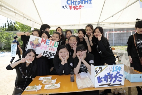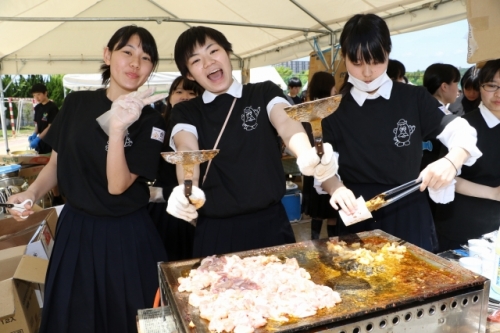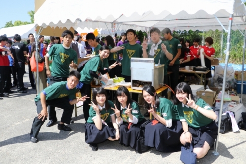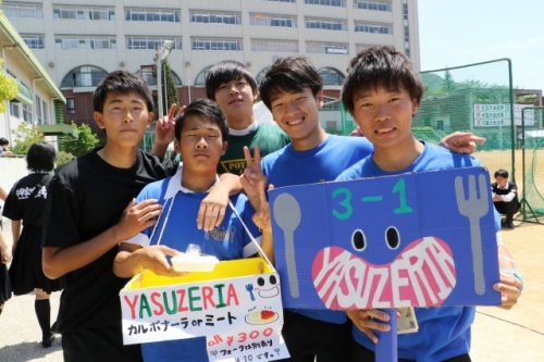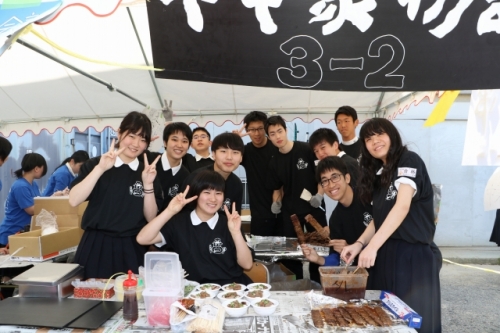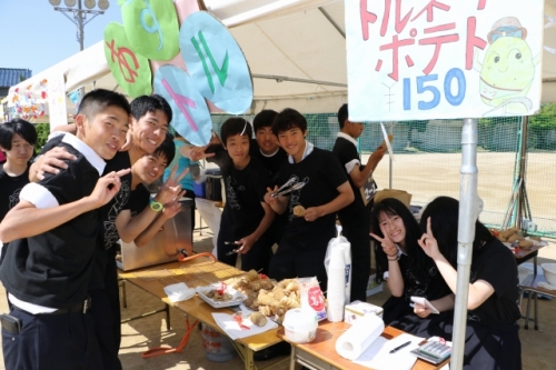 グラウンドでは育友会のバザーを始め、パスタ、フライドポテト、チョコバナナ、焼き鳥、そばめし、たこ焼き、サイコロステーキ、かき氷、チヂミなど、20店ものクラス・クラブ主催の模擬店が並びました。前日からの買い出し・仕入れ・調理に、当日は各クラスおそろいのシャツを着ての販売です。模擬店のネーミングにシャツのデザインなど、様々なところでクラスの個性が表現されていました。