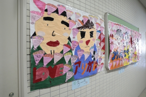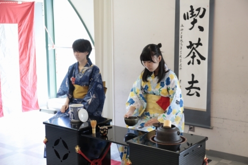 階段アートのある中央階段から校舎内に入ると、まず目に入るのは「感謝」をテーマにしたアート、そして全校生徒が両親、友達、先生などに向けて花束に書いた感謝のメッセージです。各教室では喫茶店やアイス・駄菓子などの模擬店、スーパーボールすくい、ダーツ、ボーリングなどのゲームや、ホームメイキング部のケーキ販売に創作アート部のイラスト販売、書道部や陶芸部の作品展示などがありました。二階のカフェテリアでは、茶華道部が着物姿でお茶席のおもてなしです。