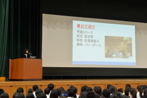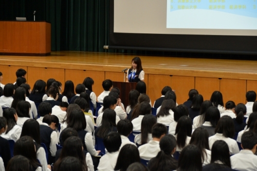 5月31日(木)、本校講堂で、卒業生9名が3年生を対象に自分の進路体験談を語るセミナーが行われました。体験談を語ってくれたのは、月島食品工場㈱、㈱茂久田商会、㈱神戸ポートピアホテル、㈱日本旅行など様々な職場で活躍している社会人4名と、香川大学、島根大学、流通科学大学、兵庫県立大学、和歌山大学で学んでいる大学生5名の卒業生たちでした。