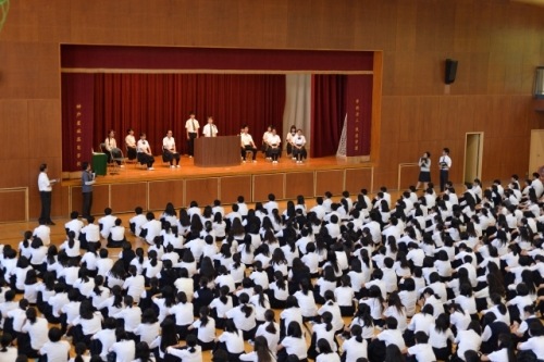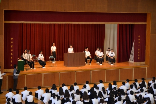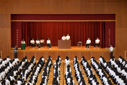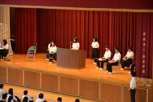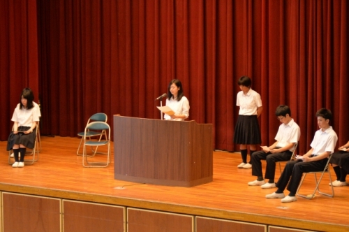 7月10日(火)、生徒会役員改選が体育館で行なわれました。生徒会役員立候補者とそれぞれの応援弁士が全校生徒に熱いメッセージを送り、立候補者の意欲を示しました。立候補者のスローガンは