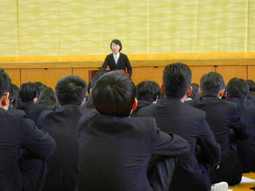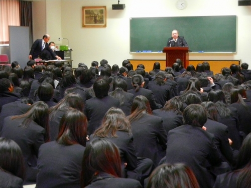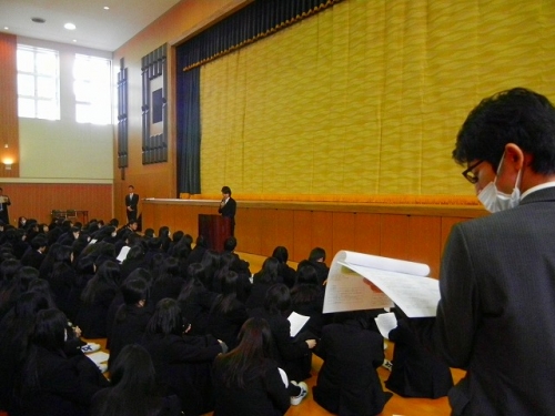 2月1日(水)の5~6時限に、商業コース生徒は大会議室で特進コース生徒は講堂に集合して、新3年制の履修科目についての説明会が行われました。それぞれ科目担任から開講予定科目の内容説明です。新3年生になると、商業コース生徒は普通科目群から1科目(選択科目)・商業科目群から1科目(課題研究)と履修します。特進A・Bコース生徒は芸術科目(音楽・書道)から1科目・普通科目群から1科目(選択科目)・商業科目群から1科目(課題研究)とそれぞれ履修します。「なりたい自分」になるために、まず自分の興味を持ち、学びたい科目を考えて保護者・学級担任に相談して決めましょう。(予備調査票2月15日 学級担任に提出)