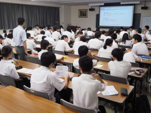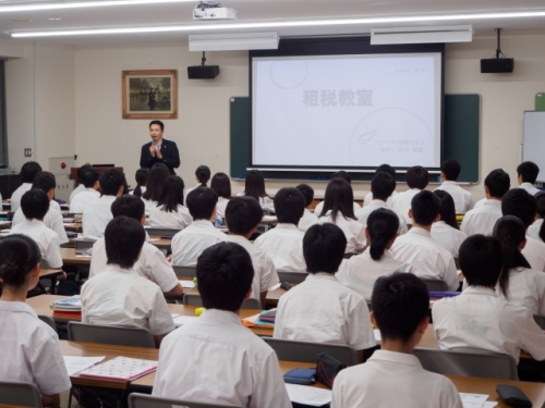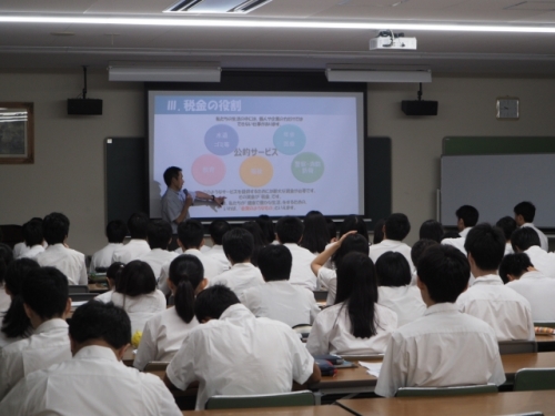 8月3日(金)、受講希望者を対象に「租税教室」を行いました。税理士の方からの「今日の講演をぜひ小論文や面接で役立ててください」との言葉で租税教室はスタートしました。日本の税の歴史、直接税と間接税、50種類にも上る税の種類、税の役割と国の財政、外国と日本の税制度の違いなど、丁寧に説明してくださいました。またグループディスカッションでは、「人口減少、少子高齢化などの現状を踏まえた上で、税収を増やし財政赤字を改善するにはどうすればよいか」をテーマに生徒同士で話し合いました。