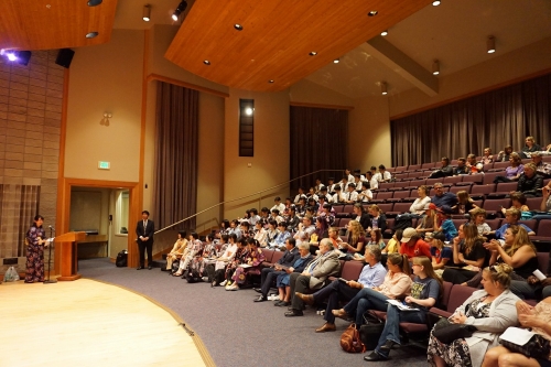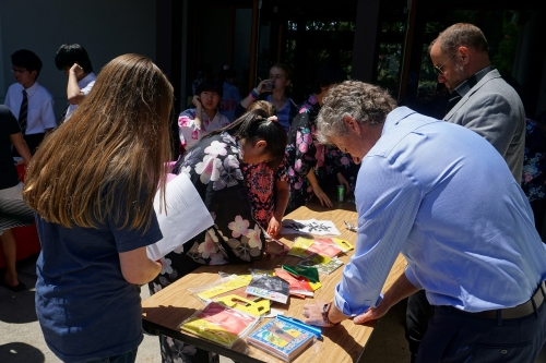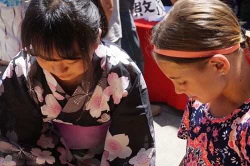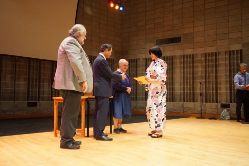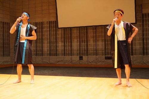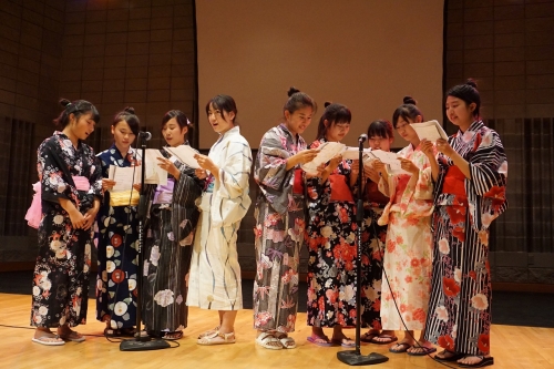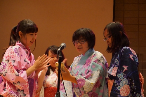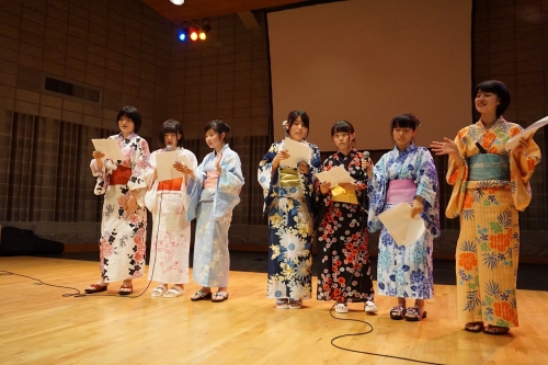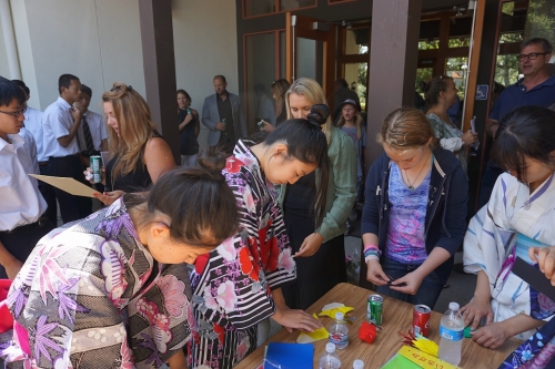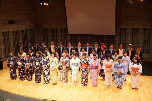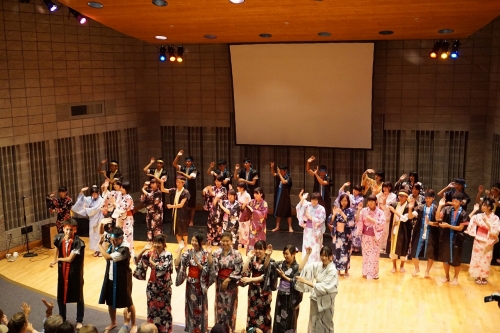 午後からはGraduation Ceremonyを行いました。生徒は感謝の気持ちを込めて、ホストファミリーをもてなし、折り紙や書道を一緒にしました。その後、生徒たちは一人ずつ名前を呼ばれ、卒業証書を受け取りました。一人一人の名前が呼ばれるたびにホストファミリーからは拍手と掛け声をかけて頂きました。また、全員で練習した「We are the World」を歌い、盆踊りやグループで歌や空手を披露しました。どのホストファミリーも喜んで、非常に盛り上がるGraduation Ceremonyとなりました。