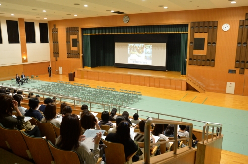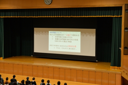 進学説明会では進学指導部長より本校からの進学について、昨年度の本校からの進学状況や検定の取得状況、大学入試制度改革に関することなどの具体的な内容に加えて、修学旅行が終われば進学へ向けて本格的にスタートすること、自分の行きたいところに自分の力を合わせていくことが必要といった話がありました。最後には「大学に入ってから通用する力をつけていきたい」と締めくくりました。
