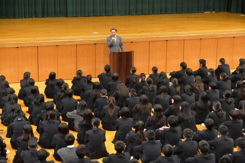 最初に学校長より「行ったことのないところへ行けば、見聞を広めることができます」「人間が生きていくうえで必要なコミュニケーション能力を培ってほしい」「4泊5日もあると、友達の色々な面が見えると思いますが、違いを認めて関係を大事にしてください」「将来について考え、どんな職に就きたいかといったことも考える機会としましょう」と激励の言葉がありました。次に、この旅行でお世話になる旅行社の添乗員の方、写真館の方などからもあいさつがありました。