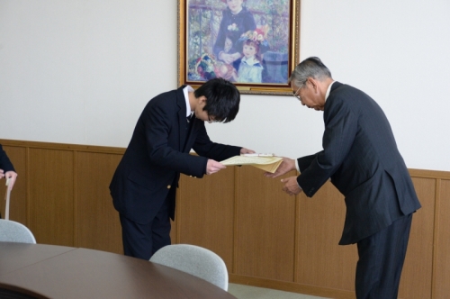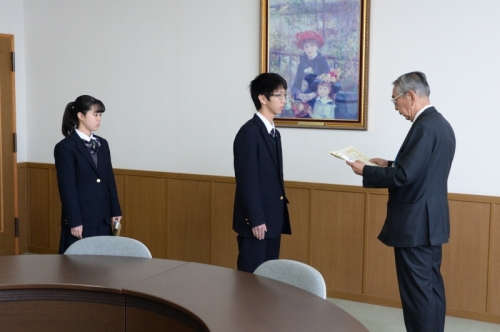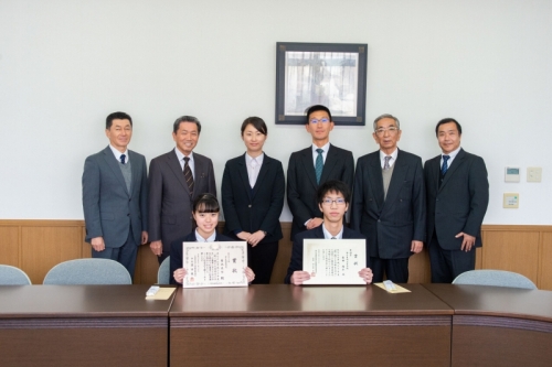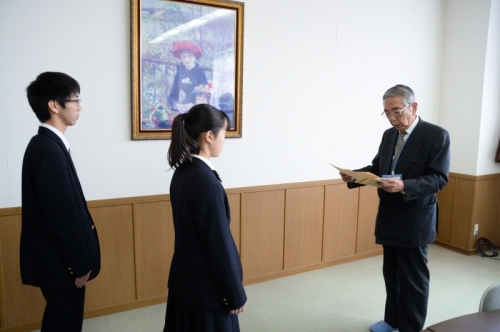 11月22日(木)、「税に関する高校生の作文」に応募した1年生から2名が優秀作品として選ばれ、本校小会議室で表彰式が行われました。表彰名、表彰者名等は下記の通りです。
