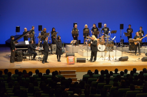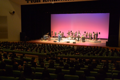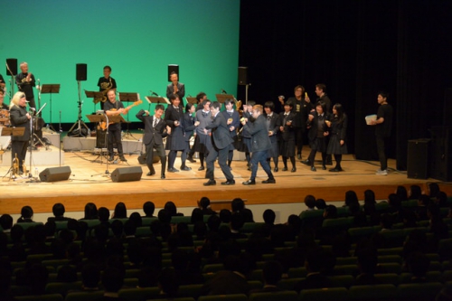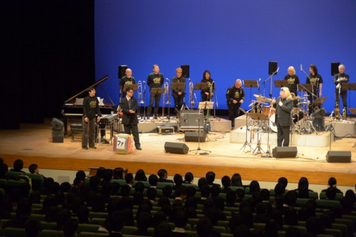 1977年の誕生以来たくさんのミュージシャンから愛され演奏されてきたスタンダード・ジャズ「Birdland」の演奏後、最後には音楽部の生徒と一緒に「ルパン三世のテーマ」を演奏し、幕を閉じました。生徒はEM BANDによる演奏を聞き、ビッグバンドジャズの魅力を存分に味わったようでした。