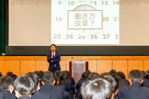 初めに、「将来起業したい人はいるか?」と聞くと、2人ほど手が挙がり、プログラミング関連の会社をしたいという生徒がおり、びっくりさせられました。その後、起業率の多い県は「香川県」で二毛作ができるから、中小企業が減少しており外国企業に頼っていること、働き方改革で副業OKという政府の方針があり、本業をしながら起業をしてもよい時代になっているなど、今の社会の情勢を教えていただきました。