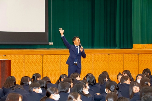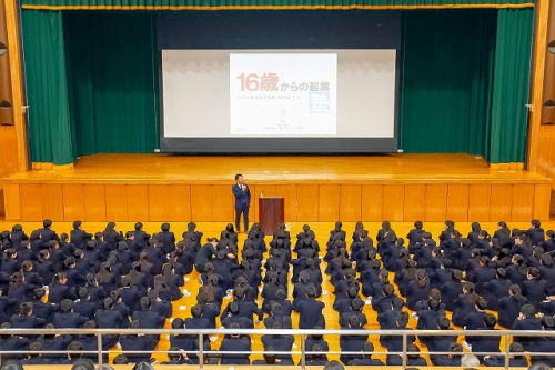 12月17日(月)、1年生全員を対象に、関西ニュービジネス協議会から谷岡樹様を講師としてお招きし、「16歳からの起業塾」という題で1時間程度講演していただきました。