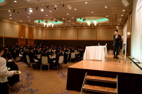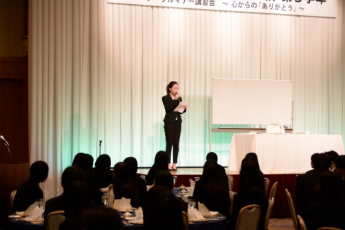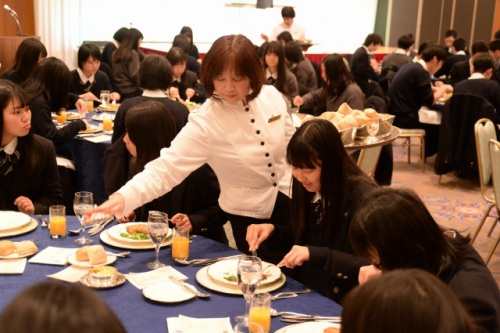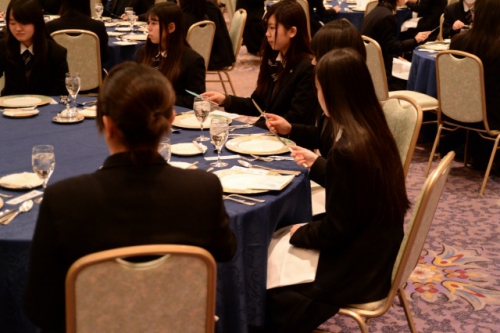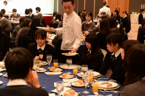 講習の始めに、同ホテルに勤務している本校卒業生より話をしていただきました。4月から就職する生徒も多く、社会人として立派に活躍している先輩の姿をしっかり目に焼き付けていました。その後、座席の座り方から、ナイフ・フォークの使い方とマナー指導が始まりました。生徒たちは慣れない雰囲気とフランス料理のフルコースに戸惑いながらも、社会人になるにあたって当然身につけておくべきマナーを実習し、体験しました。