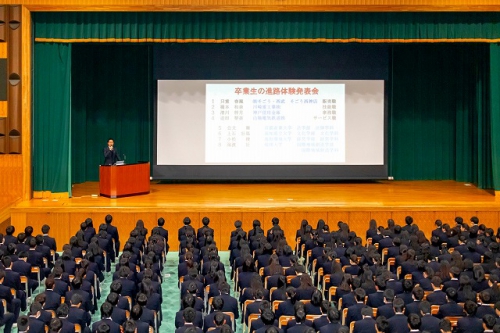 8日(土)に、1・2年生対象に「卒業生による進路体験発表会」が行われました。まず最初に、「誰の言葉、どの時期、どのようなことが心に響くかは、人それぞれ」「今の自分はこれでいいのか、将来を見つめ直す機会にしてほしい」など、会を催す理由が説明されました。