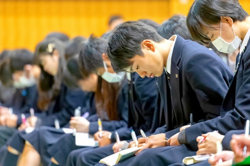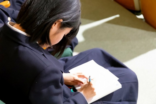 その後、副校長先生からは、1・2年生に「どんな思いでここに座っているのか」「卒業生がどんな思いでここに来てくれているのか」と問いかけがあり、また、「メモを取ることの大切さ」についての講和もあり、生徒一人ひとりが会に出席する意味を理解した上で、臨みました。