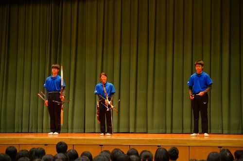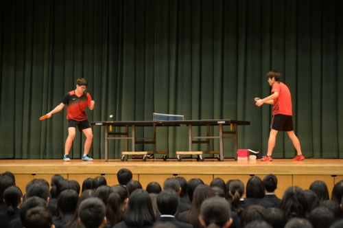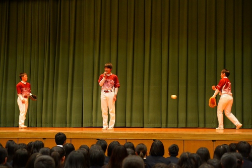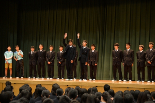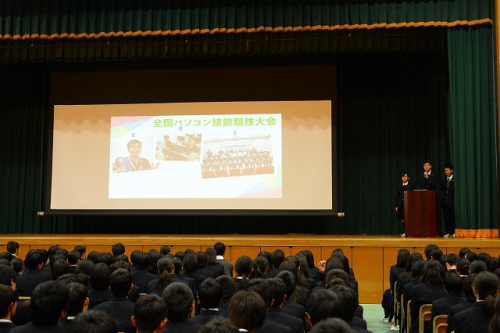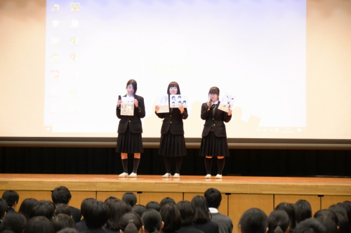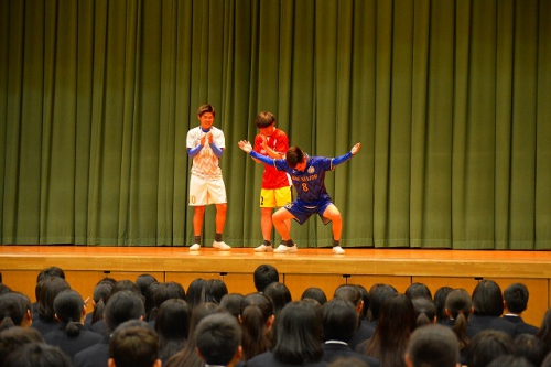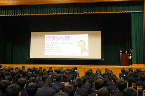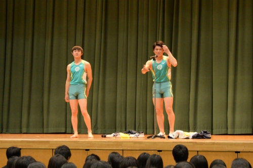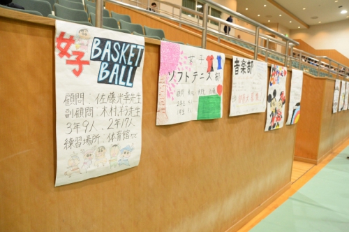 2・3校時には、1年生を対象にクラブ紹介がありました。各クラブ代表者は新入部員勧誘のため、楽器演奏やユニホーム姿で漫才など、工夫を凝らしての個性あるパフォーマンスに笑いと拍手が起こりました。