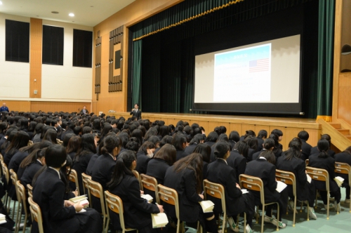 昨年プログラムに参加した生徒が、作成したパワーポイントを使いながら自身の体験を発表しました。語学研修・モントレー市長訪問・消防署見学・ロサンゼルス市内観光にホストファミリーとの日常生活の様子を紹介し、単なる旅行や研修でなく充実した本校独自のホームステイ・プログラムであることを説明しました。詳しい日程・内容は、新入生保護者会でお配りしたパンフレットを参考にしてください。途中でのキャンセルは可能ですので、少しでも可能性のある方はとりあえずお申し込みいただくことをお勧めします。(申込書締切日4月24日(水))