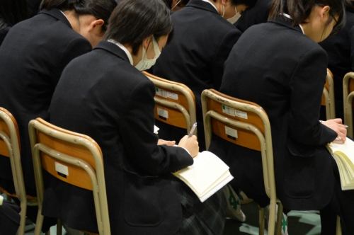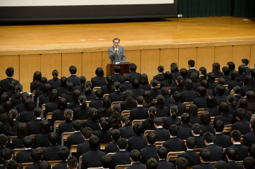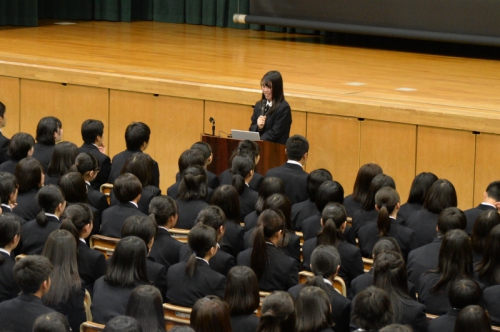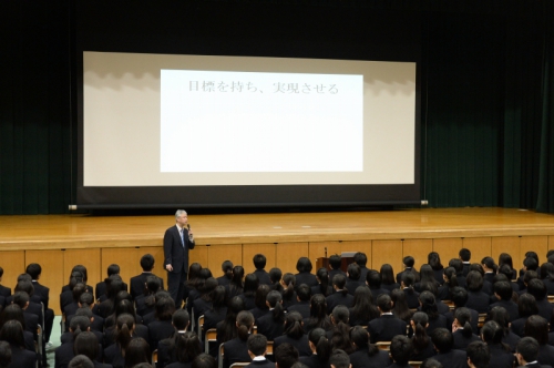 最初に校長先生から「オリエンテーションというのは『方向付け』という意味があります。どういう心がけや思いで3年間過ごすかというのはとても大事なことです」「この学校に第一希望で入学した人も、そうでない人も、この学校に入ったということは縁があったということです」 「多くの検定試験を受け、合格することで自信をつけ、自分を認めてください」「色々なことに興味・関心を持ってください。自分ができること・好きなことを探せば、それが将来にもつながります」「最近はSNS等を使って簡単に話すことができますが、誤解が生じることも多くあります。面と向かって会話することを大事にしてください」「普段から新聞やニュースを見て文字に親しみ、文章を書く力を身につけてください」といった内容の話がありました。