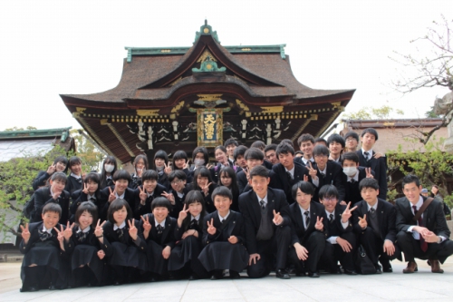 1組・2組は嵐山に到着し、1時間30分ほど嵐山商店街を自由散策した後、トロッコ嵐山駅から嵯峨野トロッコ列車に乗車し、京都の自然を堪能しました。トロッコ亀岡駅に到着後、バスで北野天満宮(=天神さまの総本社)へ向かい、高校卒業後の「進路決定」という人生の重要なターニングポイントを迎える生徒たちは「学問の神様」の菅原道真公(=菅公)をまつる本殿にて、全員で「学業成就」のご祈祷を受けました。その後は北野天満宮内でお守りやおみくじなどを購入し、14時20分ごろに北野天満宮を出発して帰路につきました。
