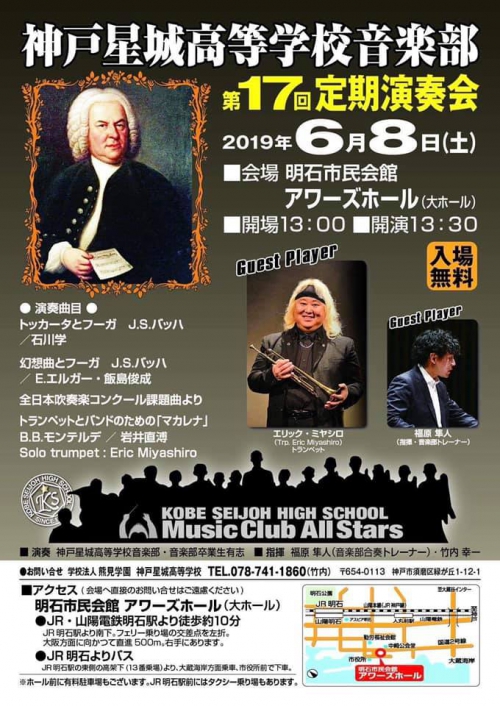 6月8日(土)13:30から明石市民会館アワーズホール(大ホール)で、本校音楽部が第17回定期演奏会を行います。本校の音楽部の部員だけでなく、OBやハワイ生まれのトランペット奏者 エリック・ミヤシロさんも出演しますので、ぜひお越しください。
