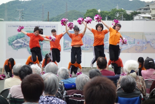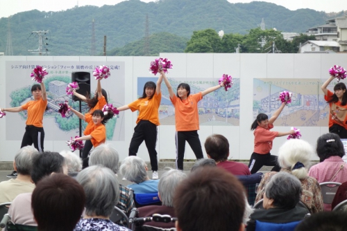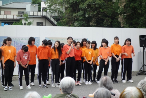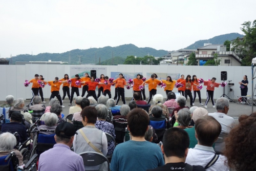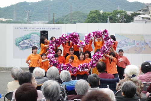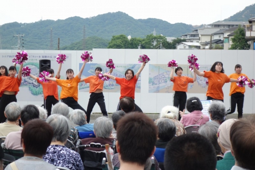 6月2日(日)、KOBE須磨きらくえんで「青空市(主催 社会福祉法人きらくえん)」が開催され、11時からのオープニングステージに本校のダンス部が出演させていただきました。手拍子などで会場も大いに盛り上がり、多くの来場者の方に喜んでいただくことで、部員たちも緊張がほぐれ気分よく踊ることができました。最後のポンポンを使ったパフォーマンスのあとは盛大な拍手をいただき、子供からお年寄りまでたくさんの方に楽しんでいただきました。