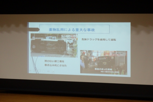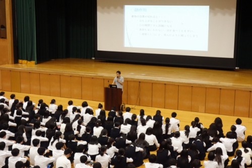 違法薬物の種類や引き起こす症状などの基本的なことから、「薬物は自分の人生を狂わす」「脳を破壊され、一度壊れた脳は元に戻らない」「薬物の効果が切れると、幻聴や幻覚などの副作用に悩まされ、楽になるためにと繰り返して薬物を使用するので一度使用するとなかなかやめられない」など薬物に手を出すことの危険性の話がありました。「危険ドラッグは薬物によって心拍数、血圧、呼吸が正常でなくなり最悪死に至る」「危険ドラッグは何を混ぜているか分からないので、倒れても治療のための薬がわからずどうしようもできない」など、危険ドラッグの危険性についても説明がありました。