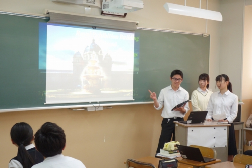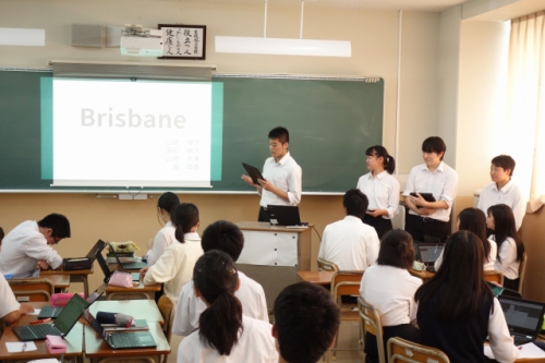 授業は、問題をグループごとで考え先生の助けを借りず解答をしたり、ICT機器を活用し、グループで調べ学習をして作成したスライドを使って英語でプレゼンテーションを行い、発表に対して他の見方がないか様々な考え方を共有したり評価したりと、生徒たち全員が勉強に対するモチベーションを上げ、頭をフル活用する時間となりました。そして、知識活用力や課題解決力に加えて主体性、協働性などを身につけるための内容にもなっていました。