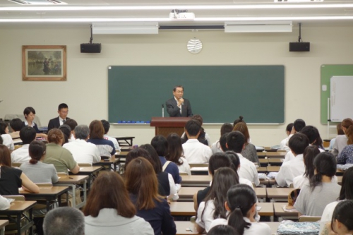 第37回海外教育研修(アメリカ)の結団式を7月9日(火)に本校の大会議室で行いました。参加生徒60名とその保護者に対し、出発から帰国までのスケジュールと内容の説明、アメリカと日本の文化の違い、ホームステイ先のホストファミリーとの接し方などについて校長から説明が行われました。また引率教員の紹介、代表生徒による決意表明の後、旅行社の方からより具体的な説明がありました。