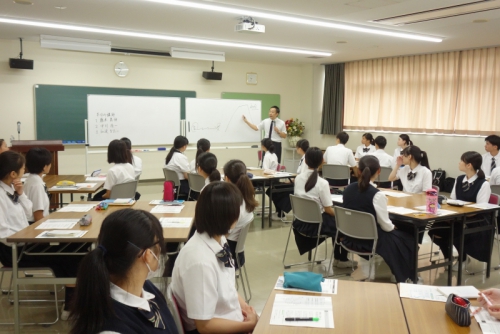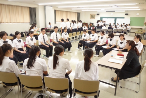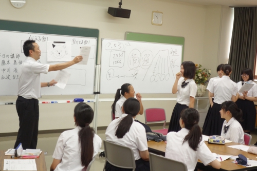 ガイダンスは求人倍率の説明から始まりました。「高校新卒者には何が求められるか?」という話では、実際に高校生の採用で重視されていることの1位は「コミュニケーション能力」で、「コミュニケーション」には笑顔やマナーといった目に見える第一印象が重要であることを踏まえて、生徒たちは第一印象をよくするための笑顔の作り方や身だしなみを教わりました。そしてコミュニケーション力を高めるために、グループで図形伝達ゲームを行い、その中で以下のようなポイントが挙げられました。